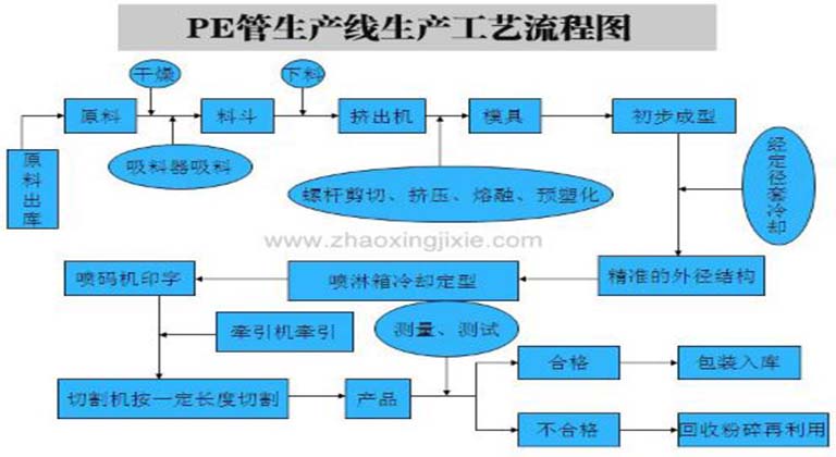 注:每個廠家所生產(chǎn)的PE管生產(chǎn)線設備的配置會有所區(qū)別,但總體的生產(chǎn)工藝流程基本上差不多,以下是詳細的工藝流程圖: